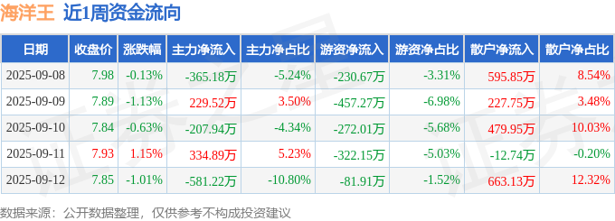 资金流向数据方面,本周海洋王主力资金合计净流出589.93万元,游资资金合计净流出1364.01万元,散户资金合计净流入1953.94万元。本周资金流向一览见下表: