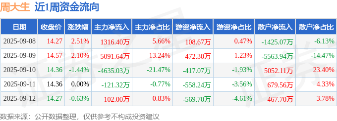 资金流向数据方面,本周周大生主力资金合计净流入1753.69万元,游资资金合计净流出964.04万元,散户资金合计净流出789.65万元。本周资金流向一览见下表: