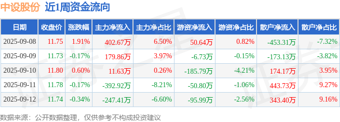 资金流向数据方面,本周中设股份主力资金合计净流出46.17万元,游资资金合计净流出288.69万元,散户资金合计净流入334.86万元。本周资金流向一览见下表: