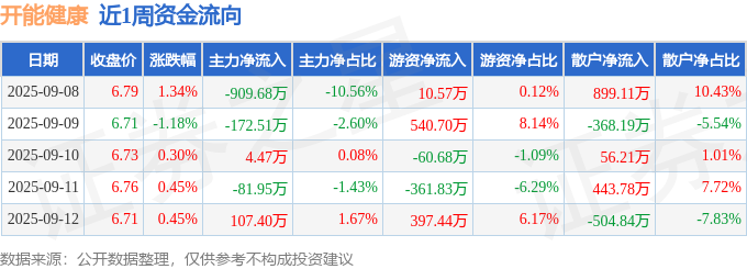资金流向数据方面,本周开能健康主力资金合计净流出1052.27万元,游资资金合计净流入526.21万元,散户资金合计净流入526.07万元。本周资金流向一览见下表: