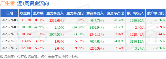 资金流向数据方面,本周广生堂主力资金合计净流入1.35亿元,游资资金合计净流出1504.03万元,散户资金合计净流出1.2亿元。本周资金流向一览见下表: