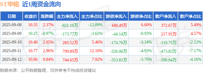 资金流向数据方面,本周ST华铭主力资金合计净流入835.13万元,游资资金合计净流出450.28万元,散户资金合计净流出384.84万元。本周资金流向一览见下表: