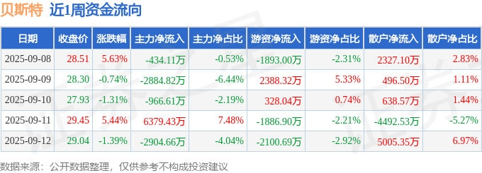 资金流向数据方面,本周贝斯特主力资金合计净流出810.76万元,游资资金合计净流出3164.23万元,散户资金合计净流入3974.99万元。本周资金流向一览见下表: