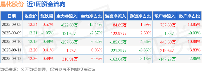 资金流向数据方面,本周晨化股份主力资金合计净流出889.32万元,游资资金合计净流出362.8万元,散户资金合计净流入1252.12万元。本周资金流向一览见下表: