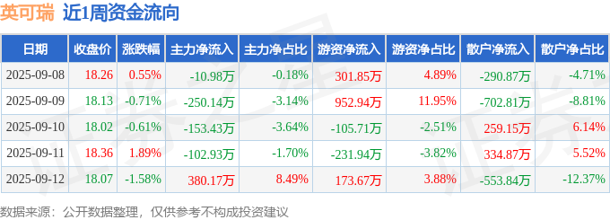 资金流向数据方面,本周英可瑞主力资金合计净流出137.31万元,游资资金合计净流入1090.81万元,散户资金合计净流出953.5万元。本周资金流向一览见下表:
