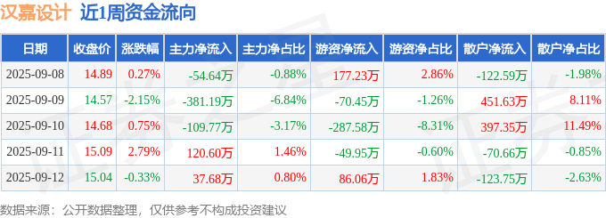资金流向数据方面,本周汉嘉设计主力资金合计净流出387.31万元,游资资金合计净流出144.67万元,散户资金合计净流入531.99万元。本周资金流向一览见下表: