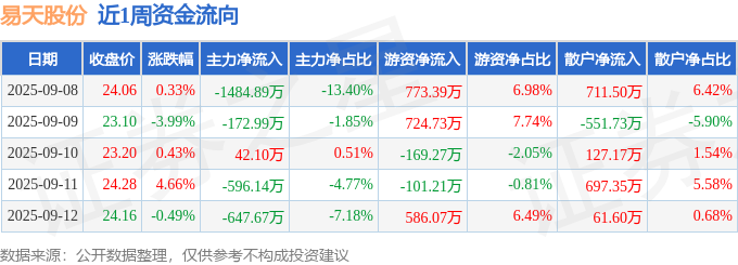 资金流向数据方面,本周易天股份主力资金合计净流出2859.59万元,游资资金合计净流入1813.71万元,散户资金合计净流入1045.88万元。本周资金流向一览见下表: