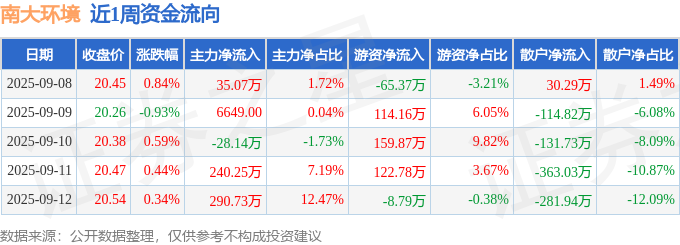 资金流向数据方面,本周南大环境主力资金合计净流入538.57万元,游资资金合计净流入322.65万元,散户资金合计净流出861.22万元。本周资金流向一览见下表: