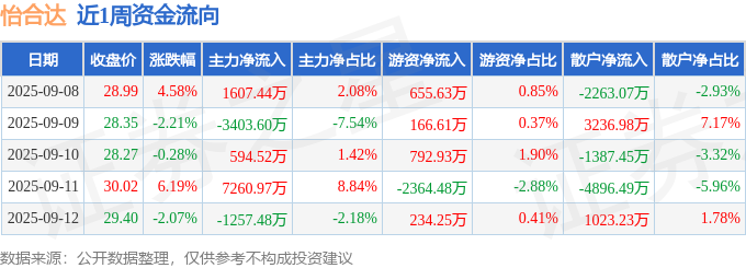 资金流向数据方面,本周怡合达主力资金合计净流入4801.85万元,游资资金合计净流出515.05万元,散户资金合计净流出4286.8万元。本周资金流向一览见下表: