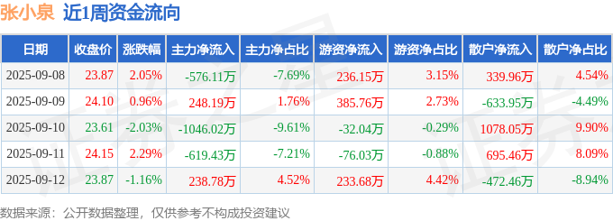 资金流向数据方面,本周张小泉主力资金合计净流出1754.59万元,游资资金合计净流入747.52万元,散户资金合计净流入1007.06万元。本周资金流向一览见下表: