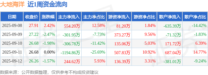资金流向数据方面,本周大地海洋主力资金合计净流出1004.78万元,游资资金合计净流入1233.74万元,散户资金合计净流出228.96万元。本周资金流向一览见下表: