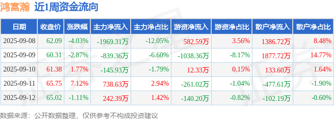 资金流向数据方面,本周鸿富瀚主力资金合计净流出1973.57万元,游资资金合计净流出844.67万元,散户资金合计净流入2818.24万元。本周资金流向一览见下表: