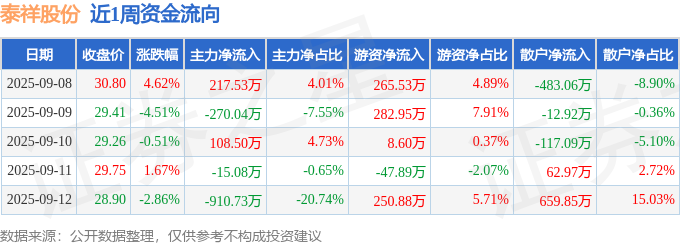 资金流向数据方面,本周泰祥股份主力资金合计净流出869.82万元,游资资金合计净流入760.06万元,散户资金合计净流入109.75万元。本周资金流向一览见下表: