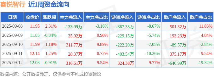 资金流向数据方面,本周喜悦智行主力资金合计净流入558.68万元,游资资金合计净流出897.83万元,散户资金合计净流入339.15万元。本周资金流向一览见下表: