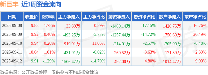 资金流向数据方面,本周新巨丰主力资金合计净流出1478.33万元,游资资金合计净流出2179.07万元,散户资金合计净流入3657.4万元。本周资金流向一览见下表: