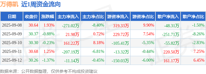 资金流向数据方面,本周万得凯主力资金合计净流出306.14万元,游资资金合计净流入280.3万元,散户资金合计净流入25.84万元。本周资金流向一览见下表:
