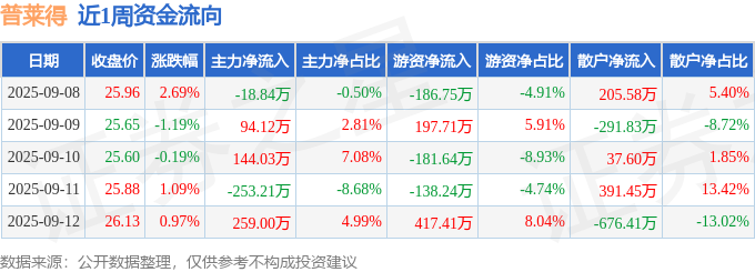 资金流向数据方面,本周普莱得主力资金合计净流入225.11万元,游资资金合计净流入108.5万元,散户资金合计净流出333.61万元。本周资金流向一览见下表: