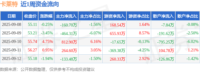 资金流向数据方面,本周卡莱特主力资金合计净流入319.01万元,游资资金合计净流入697.77万元,散户资金合计净流出1016.78万元。本周资金流向一览见下表: