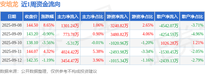 资金流向数据方面,本周安培龙主力资金合计净流入9548.6万元,游资资金合计净流入2191.36万元,散户资金合计净流出1.17亿元。本周资金流向一览见下表: