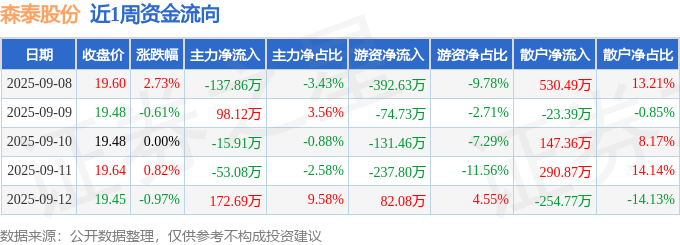 资金流向数据方面,本周森泰股份主力资金合计净流入63.97万元,游资资金合计净流出754.53万元,散户资金合计净流入690.57万元。本周资金流向一览见下表: