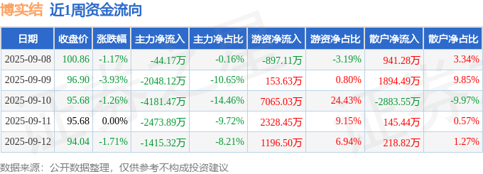 资金流向数据方面,本周博实结主力资金合计净流出1.02亿元,游资资金合计净流入9846.5万元,散户资金合计净流入316.47万元。本周资金流向一览见下表: