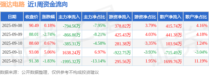 资金流向数据方面,本周强达电路主力资金合计净流出2403.76万元,游资资金合计净流入458.43万元,散户资金合计净流入1945.32万元。本周资金流向一览见下表: