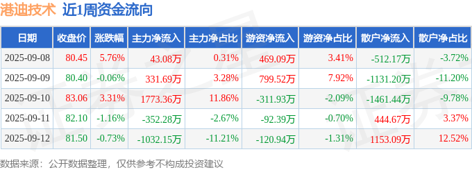 资金流向数据方面,本周港迪技术主力资金合计净流入763.71万元,游资资金合计净流入743.35万元,散户资金合计净流出1507.06万元。本周资金流向一览见下表: