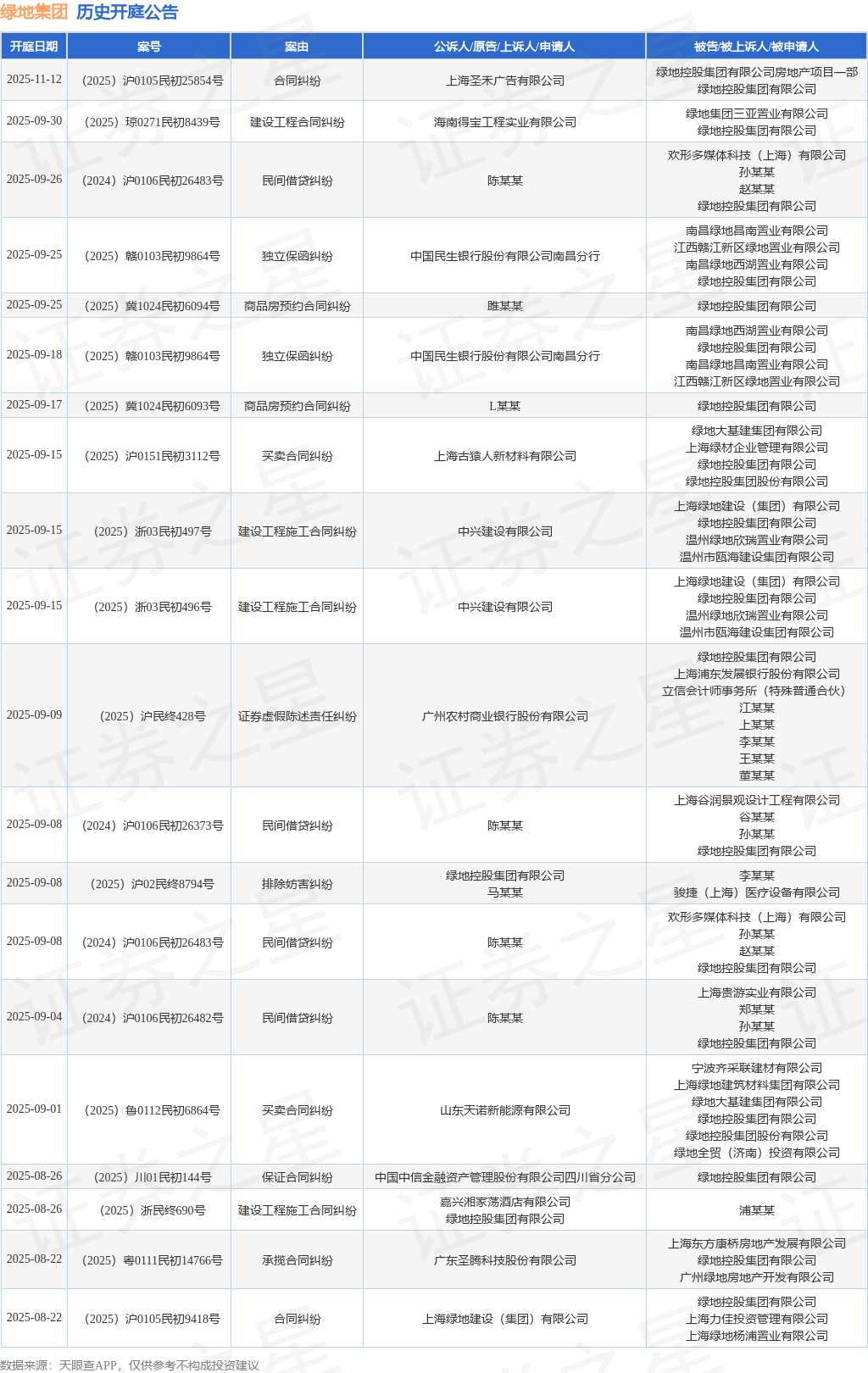 案号:(2025)冀1024民初6093号根据统计,近一年内以绿地控股集团有限公司为当事人的历史开庭公告有202则,其中案由为“建设工程施工合同纠纷”的公告以29则居首,其次为“金融借款合同纠纷”有25则,“合同纠纷”有19则。历史开庭公告(前20条)如下: