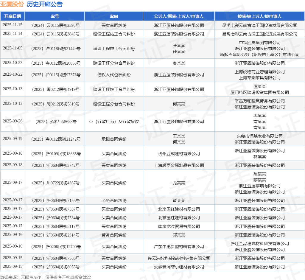 案号:(2025)浙0604民初7155号根据统计,近一年内以浙江亚厦装饰股份有限公司为当事人的历史开庭公告有539则,其中案由为“买卖合同纠纷”的公告以171则居首,其次为“劳务合同纠纷”有105则,“建设工程施工合同纠纷”有66则。历史开庭公告(前20条)如下: