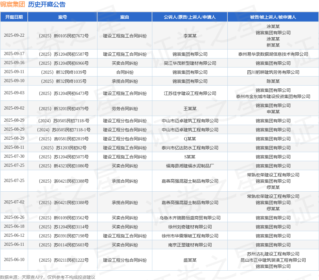 案号:(2025)苏1204民初5587号根据统计,近一年内以锦宸集团有限公司为当事人的历史开庭公告有159则,其中案由为“劳务合同纠纷”的公告以45则居首,其次为“建设工程施工合同纠纷”有33则,“买卖合同纠纷”有30则。历史开庭公告(前20条)如下: