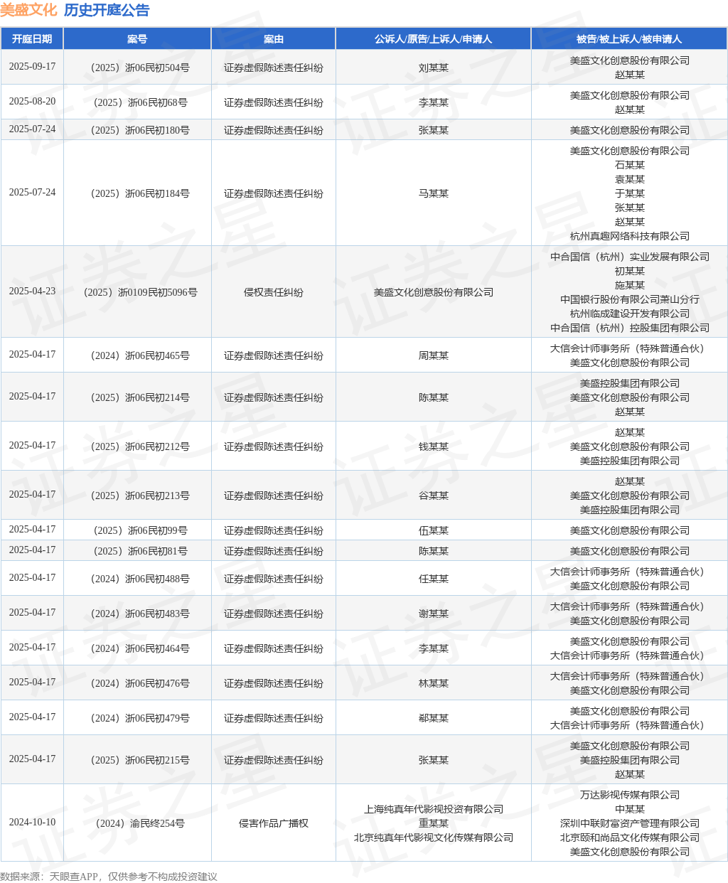 案号:(2025)浙06民初504号根据统计,近一年内以美盛文化创意股份有限公司为当事人的历史开庭公告有18则,其中案由为“证券虚假陈述责任纠纷”的公告以16则居首,其次为“侵害作品广播权”有1则,“侵权责任纠纷”有1则。历史开庭公告如下:
