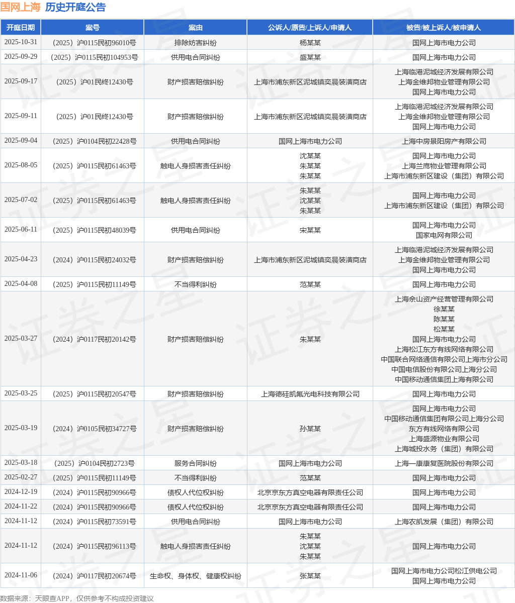 案号:(2025)沪01民终12430号根据统计,近一年内以国网上海市电力公司为当事人的历史开庭公告有22则,其中案由为“财产损害赔偿纠纷”的公告以7则居首,其次为“供用电合同纠纷”有5则,“触电人身损害责任纠纷”有3则。历史开庭公告(前20条)如下: