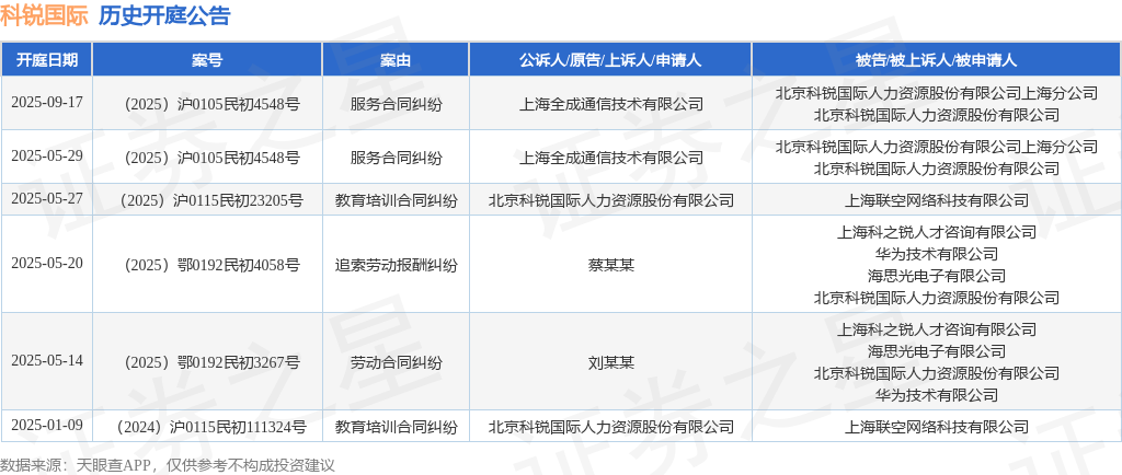 案号:(2025)沪0105民初4548号根据统计,近一年内以北京科锐国际人力资源股份有限公司为当事人的历史开庭公告有6则,其中案由为“教育培训合同纠纷”的公告以2则居首,其次为“服务合同纠纷”有2则,“劳动合同纠纷”有1则。历史开庭公告如下: