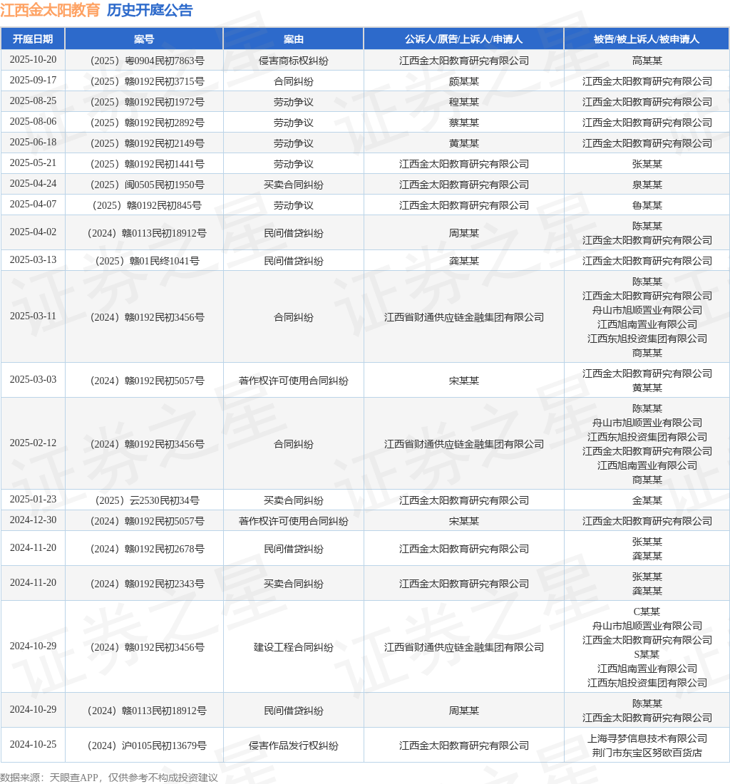 案号:(2025)赣0192民初3715号根据统计,近一年内以江西金太阳教育研究有限公司为当事人的历史开庭公告有24则,其中案由为“劳动争议”的公告以6则居首,其次为“买卖合同纠纷”有5则,“民间借贷纠纷”有5则。历史开庭公告(前20条)如下: