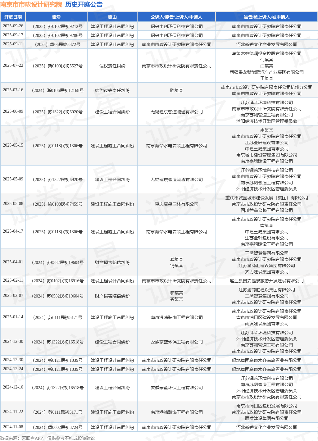 案号:(2025)苏0102民初9206号根据统计,近一年内以南京市市政设计研究院有限责任公司为当事人的历史开庭公告有21则,其中案由为“建设工程设计合同纠纷”的公告以8则居首,其次为“建设工程施工合同纠纷”有5则,“建设工程合同纠纷”有4则。历史开庭公告(前20条)如下: