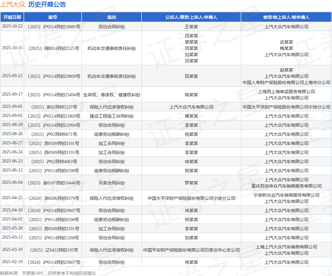 案号:(2025)沪0114民初25494号根据统计,近一年内以上汽大众汽车有限公司为当事人的历史开庭公告有34则,其中案由为“劳动合同纠纷”的公告以10则居首,其次为“保险人代位求偿权纠纷”有6则,“买卖合同纠纷”有3则。历史开庭公告(前20条)如下: