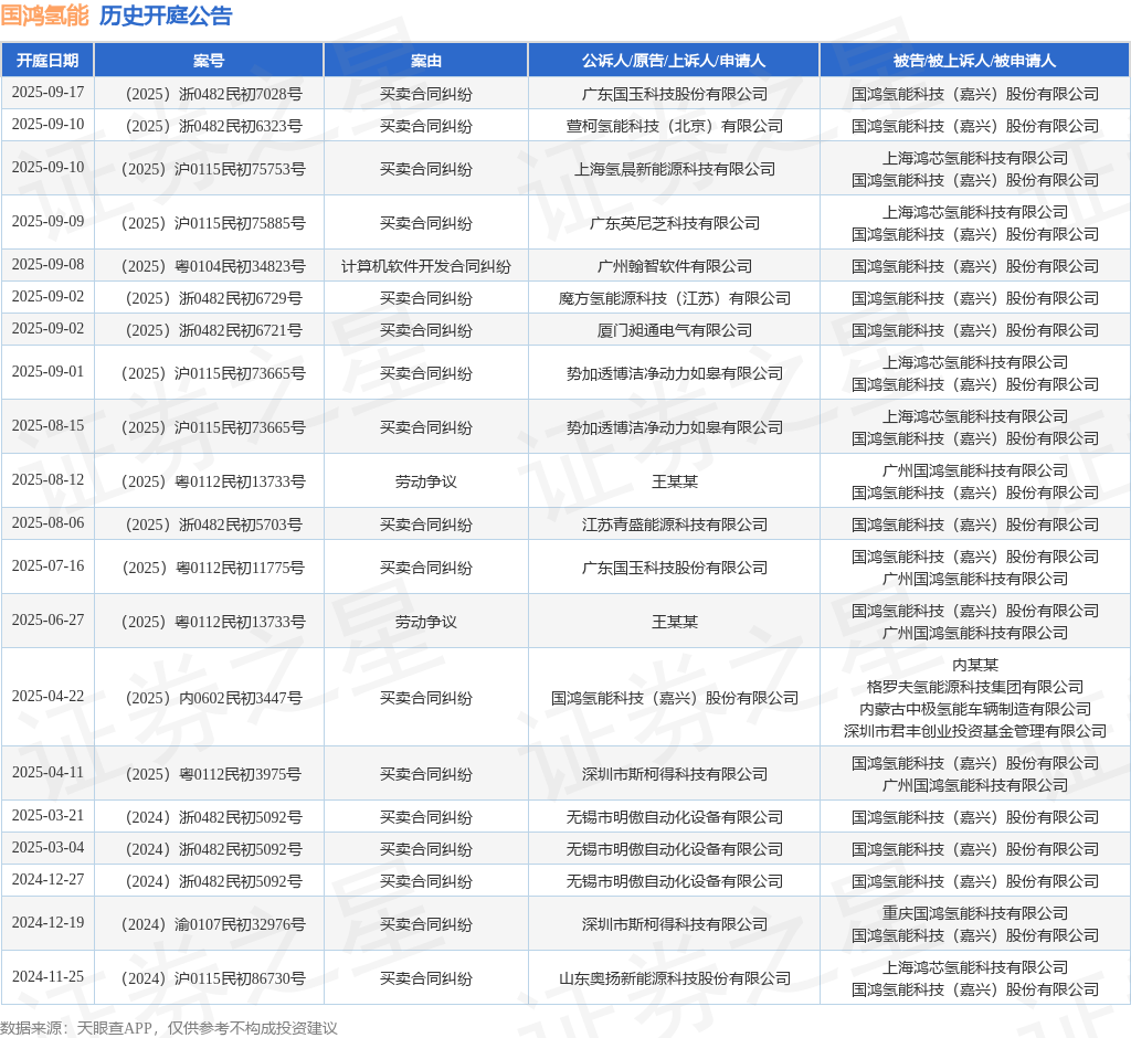 证券之星消息,根据天眼查APP显示,近日公布了一则国鸿氢能科技(嘉兴)股份有限公司作为被告/被上诉人的开庭公告,详细内容如下: