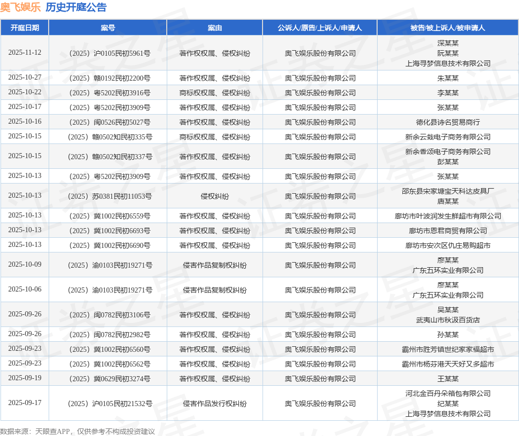 案号:(2025)赣0192民初3269号根据统计,近一年内以奥飞娱乐股份有限公司为当事人的历史开庭公告有478则,其中案由为“著作权权属、侵权纠纷”的公告以237则居首,其次为“侵害作品发行权纠纷”有56则,“侵害作品信息网络传播权纠纷”有31则。历史开庭公告(前20条)如下: