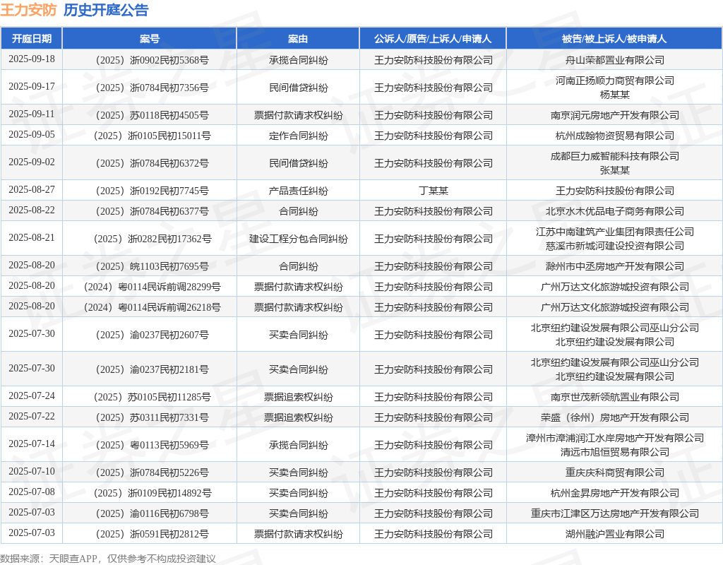 案号:(2025)浙0784民初7356号根据统计,近一年内以王力安防科技股份有限公司为当事人的历史开庭公告有118则,其中案由为“票据追索权纠纷”的公告以24则居首,其次为“买卖合同纠纷”有18则,“票据付款请求权纠纷”有14则。历史开庭公告(前20条)如下: