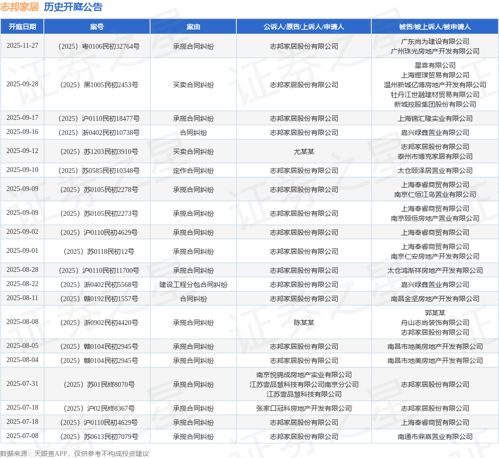 案号:(2025)沪0110民初18477号根据统计,近一年内以志邦家居股份有限公司为当事人的历史开庭公告有160则,其中案由为“承揽合同纠纷”的公告以54则居首,其次为“买卖合同纠纷”有48则,“建设工程分包合同纠纷”有11则。历史开庭公告(前20条)如下: