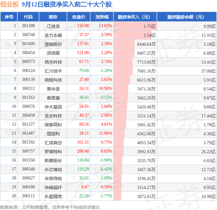 创业板融资净买入前三分别为:江波龙(301308)融资净买入1.75亿元、金力永磁(300748)融资净买入1.54亿元、慧翰股份(301600)融资净买入8446.64万元,前20具体见下表: