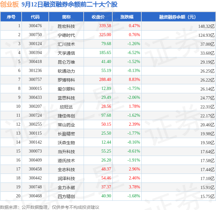 创业板融资融券余额前三分别为:胜宏科技(300476)融资融券余额148.32亿元、宁德时代(300750)融资融券余额124.93亿元、汇川技术(300124)融资融券余额37亿元,前20具体见下表:
