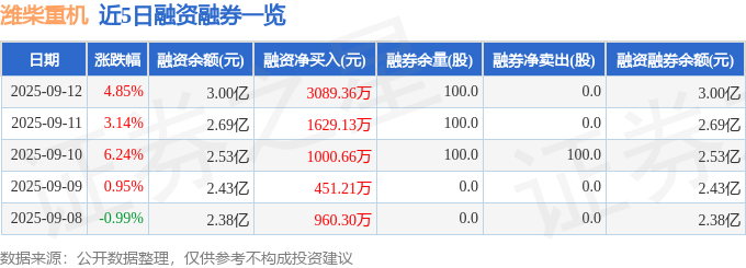 潍柴重机融资融券信息显示,融资方面,当日融资买入1.68亿元,融资偿还1.38亿元,融资净买入3089.36万元,连续3日净买入累计5719.15万元。融券方面,融券卖出0.0股,融券偿还0.0股,融券余量100.0股,融券余额0.51万元。融资融券余额3.0亿元。