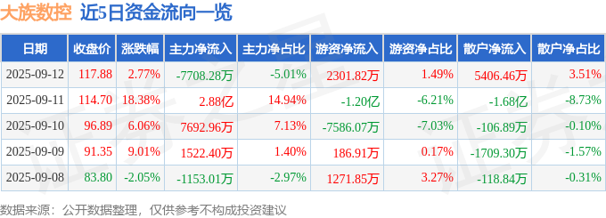 证券之星消息,截至2025年9月12日收盘,大族数控(301200)报收于119.26元,上涨3.98%,换手率2.65%,成交量11.18万手,成交额12.9亿元。