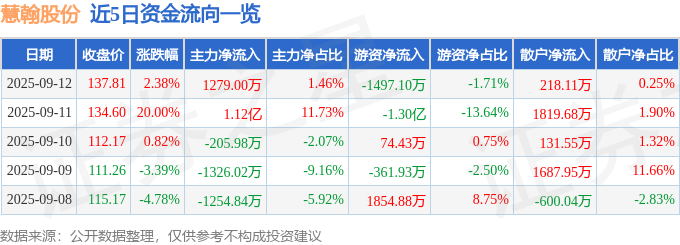 证券之星消息,截至2025年9月12日收盘,慧翰股份(301600)报收于137.63元,上涨2.25%,换手率13.93%,成交量4.5万手,成交额6.03亿元。