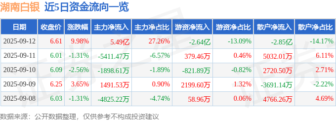 证券之星消息,截至2025年9月12日收盘,湖南白银(002716)报收于6.61元,上涨9.98%,涨停,换手率13.56%,成交量299.66万手,成交额19.34亿元。