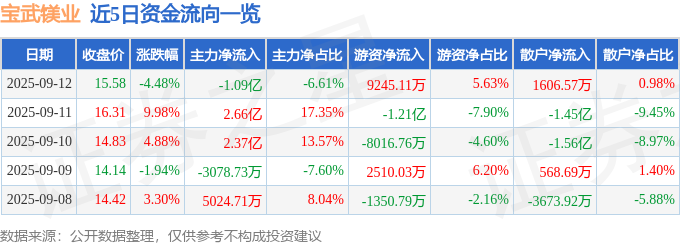 证券之星消息,截至2025年9月12日收盘,宝武镁业(002182)报收于15.66元,下跌3.99%,换手率9.34%,成交量80.88万手,成交额12.65亿元。