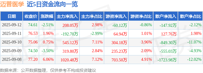 证券之星消息,截至2025年9月12日收盘,迈普医学(301033)报收于74.78元,下跌2.29%,换手率1.25%,成交量7016.0手,成交额5266.8万元。