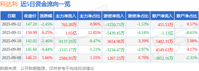 证券之星消息,截至2025年9月12日收盘,科达利(002850)报收于148.01元,下跌1.92%,换手率2.0%,成交量3.94万手,成交额5.9亿元。