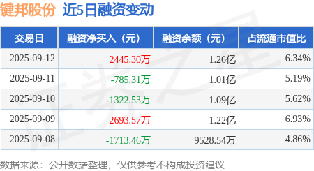 证券之星消息,9月12日,键邦股份(603285)融资买入7162.86万元,融资偿还4717.55万元,融资净买入2445.3万元,融资余额1.26亿元。